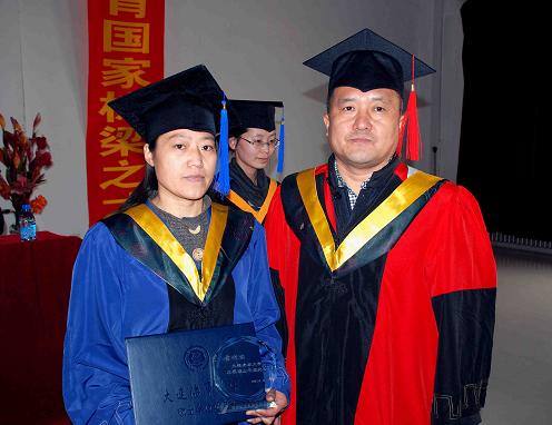 海大信息科學(xué)技術(shù)學(xué)院副院長(zhǎng)曹德信(右)為學(xué)員李娜頒發(fā)碩士學(xué)位證書及紀(jì)念牌。